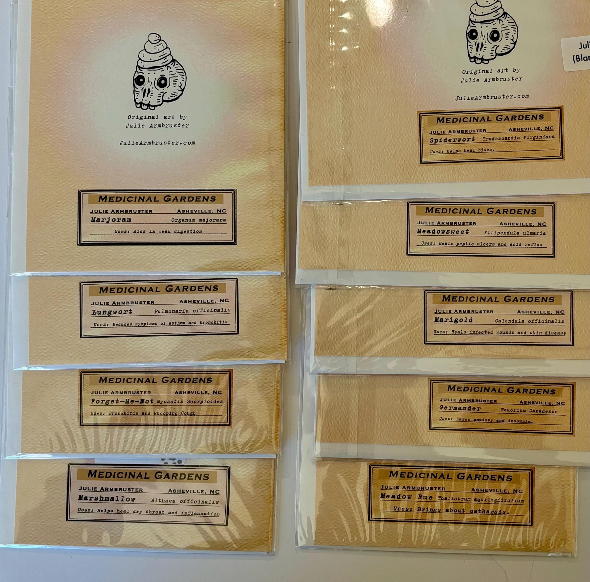 All 9 greeting cards featuring my original medicinal garden designs. Was originally produced for the gift shop at The Mutter Museum in Philly. Beautifully printed each one has a vintage name plate on back with scientific name and the herbs used.