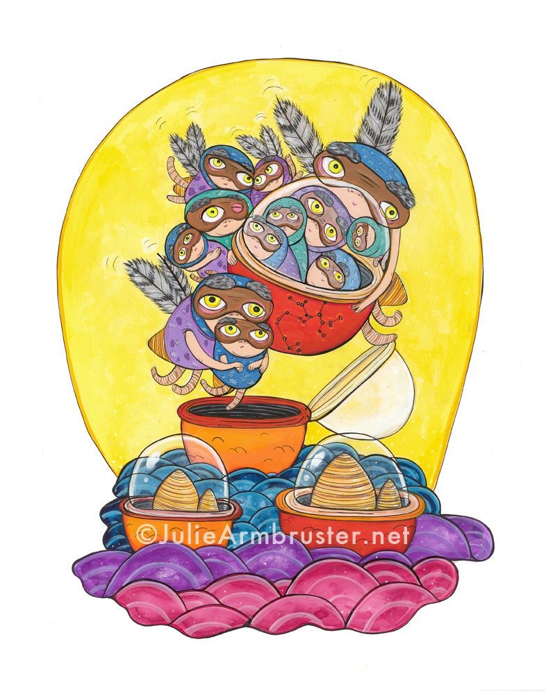 Beginning with a print of the circles/stars in the 12 zodiac configurations, I converted the stars into eyeballs. I then constructed the creatures and environments around the eyeballs. The original figures were used to tell stories and explain that which was unexplainable. My characters will do the same thing.